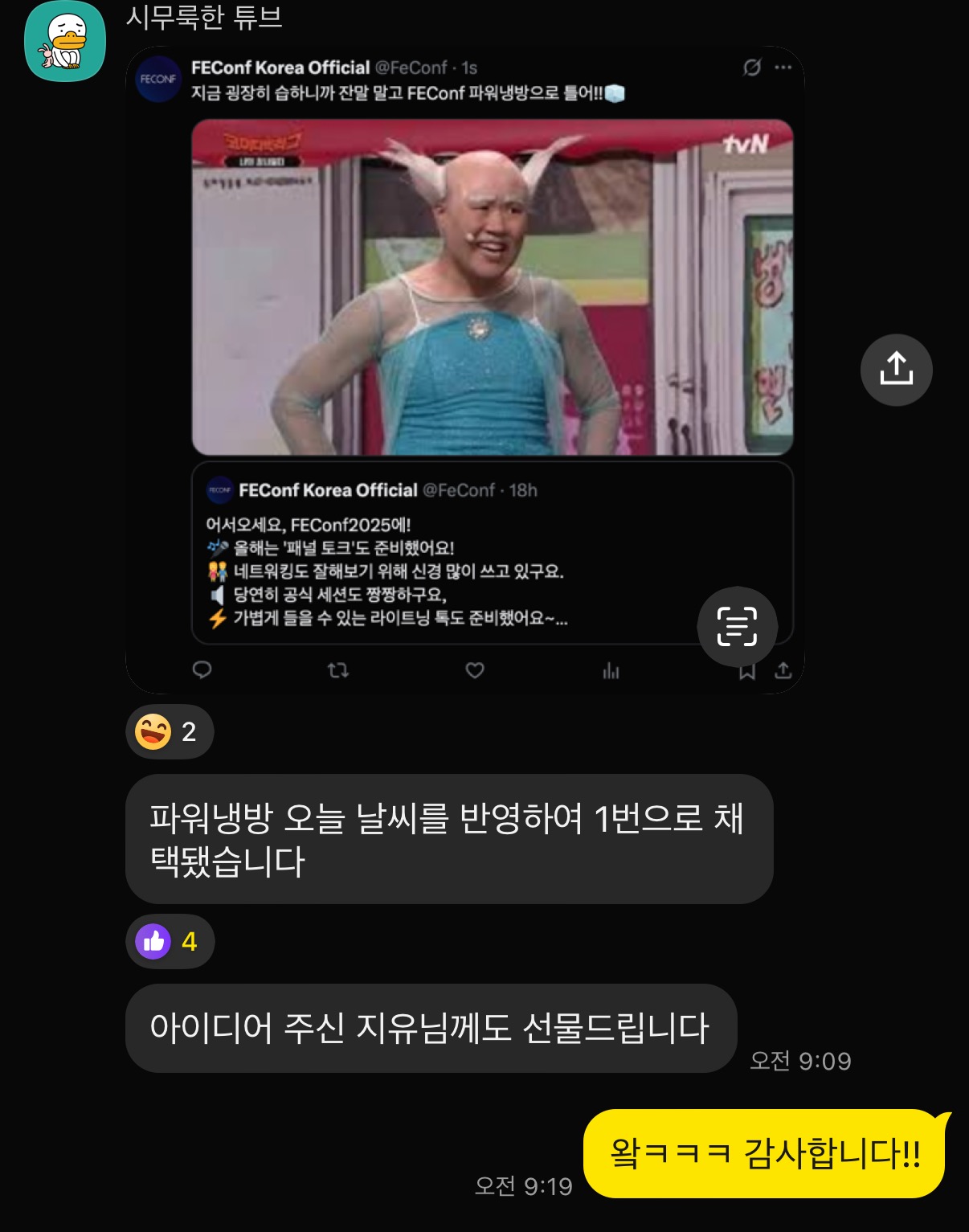 어느 날 친구로부터 FEConf2025 스태프를 뽑는다고 당장 지원하라고 연락을 받게 되었습니다.
